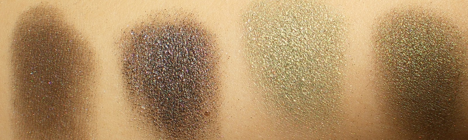 Schimmern die Farben im Licht nicht einfach wunderschön? Wie ihr sehen könnt, haben wir hier einen eher matten Ton, zwei mit feinen Glitzerpigmenten und einen Schimmernden.