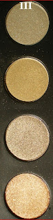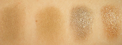 Nr. 1 würde ich als sehr dezentes, rauchiges Braun beschreiben. Nr. 2 besitzt einen leichten Goldeinschlag, während die Nr. 3 besonders auf dem Lid stark ins grünliche geht! Und zu guter Letzt haben wir noch die Nr. 4. Einen glitzernden und dennoch dezenten Bronzeton.