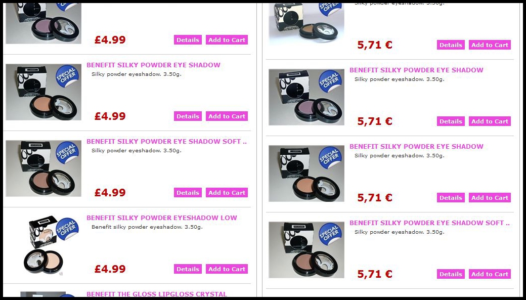 Wie beschrieben, handelt es sich um ein Outlet. Kurzum wechselt das Sortiment stetig, aber die Preise bewegen sich immer in einem niedrigen Rahmen. Für einen MAC Eyeshadow im Döschen zahlt man derzeit umgerechnet 9€, für einen Blush 11€ – Also im Vergleich zu den Originalpreisen ein Bruchteil.
