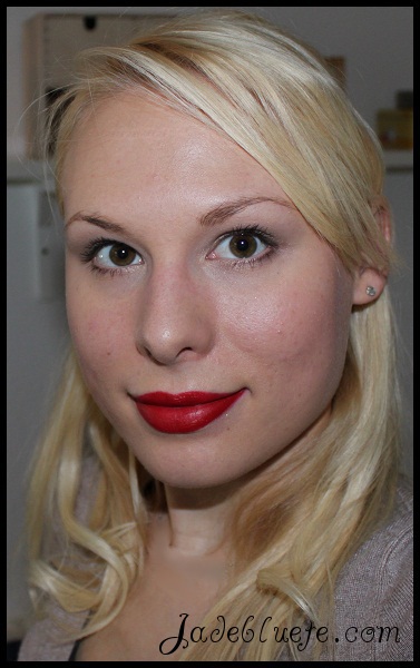 Ich finde es sehr hübsch, aber für meinen Geschmack fehlt an den Augen noch ein dunkles Gegengewicht zu den Lippen. Entweder mehr Wimperntusche, dunklerer Lidschatten in der Crease oder ein schwarzer Lidstrich.