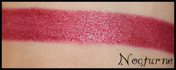 Nocturne ist ein wunderschönes, von der Grundfarbe her relativ dunkles Rot, welches sehr viele goldene Schimmerpartikel enthält. Diese Schimmerpartikel sind super fein und auf den Lippen (selbst für empfindliche Menschen, wie mich) nicht zu spüren. ABER sie sind sichtbar und lassen Nocturne richtig schön weihnachtlich, gülden schimmern.