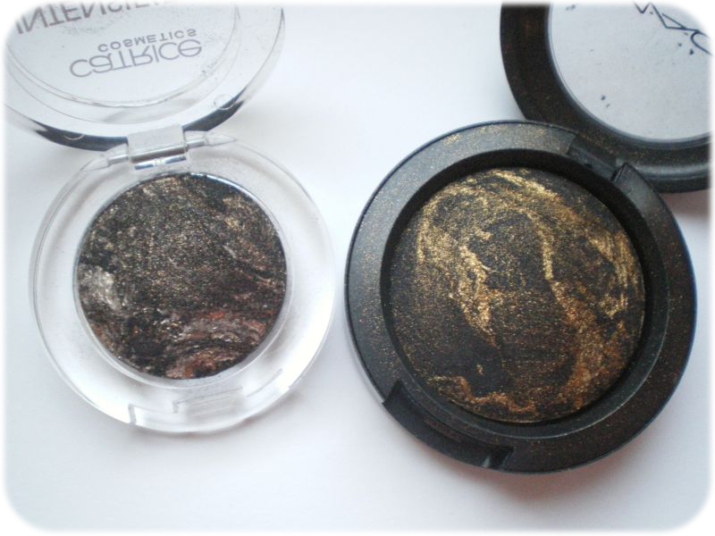 Schon beim Pfännchenvergleich der beiden genutzten Exemplare wird klar: Wirklich viel Ähnlichkeit haben die beiden nicht. Sie besitzen zwar beide eine Marmorierung, in der Schwarz überwiegt, aber Catrice wirkt deutlich kühler als MAC. Vergrößert man das Bild, erkennt man allerdings auch im Catrice Lidschatten den goldenen Schimmer, der sich durch das Mischen ergibt.