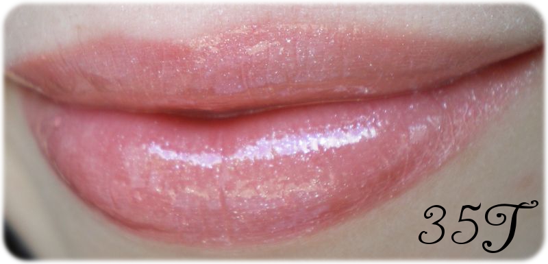 35T: Auf diesen war ich besonders gespannt, da er sehr hübsch korallig wirkt. Aber auch hier ist die Intensität auf den Lippen eher mittelmäßig. Dennoch finde ich ihn am schönsten, da der Glitzer subtiler ist.