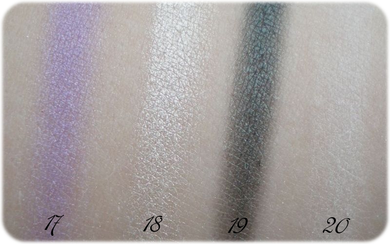 Shade 17 bis 20: In der letzten Reihe starten wir mit einem schimmernden Hellviolett, das in Ordnung ist. Daneben ein gut pigmentierter Cremeton, gefolgt von einem sehr intensiven, hübschen Dunkelgrün. Shade 20 ist hingegen die zweitgrößte Enttäuschung der Palette. Ein extrem sheerer, matter Ton, der nicht mal zum Blenden richtig taugt.