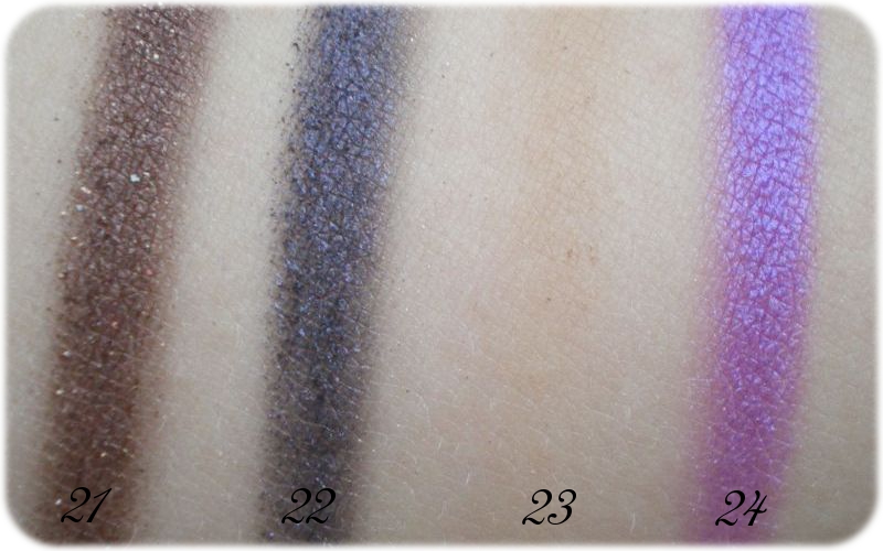 Shade 21 bis 24: Der Abschluss startet grandios mit einem leicht glitzernden, intensiven Braunton, neben dem sich ein schönes, wenn auch am Auge eher schwächeres Dunkelblau befindet. Neben diesen zwei Schätzen wartet dann die größte Enttäuschung. Der Braunton ist dermaßen hart gepresst, dass ich kaum Farbe abbekomme. Absolut unbrauchbar. Dafür endet die ganze Palette mit einem der schönsten Lidschatten von MUA, den man auch als Mono kriegt: Einem blau changierenden, knalligen Violett.