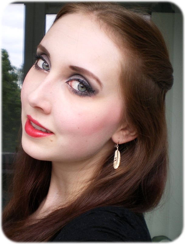 Der Plan für das Make-Up war ganz simpel: katzenhafte Smokey Eyes mit schönen, nicht allzu knalligen roten Lippen und roten Wangen. Denn an Lidschatten besitze ich von Manhattan nur einen Roten, der eher mäßig ist. Leider bin ich aber auch von dem Smokey Smile Quad nicht so wirklich begeistert. Auf den Nahaufnahmen ist andeutungsweise zu erkennen, wie staubig, sheer und schlecht pigmentiert die Nuancen sind. Schade, da ich mir sicher bin, dass es sonst wesentlich besser ausgesehen hätte.
