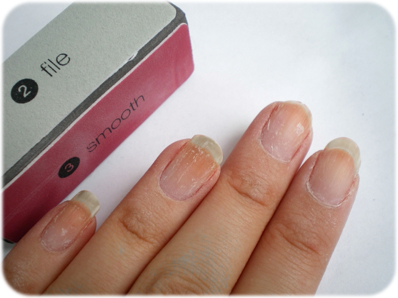 1) Vorbereitung: Mit der grauen Seite der Nagelfeile wird der Glanz von den Nägeln gebuffert. So bricht man die Versieglung auf.