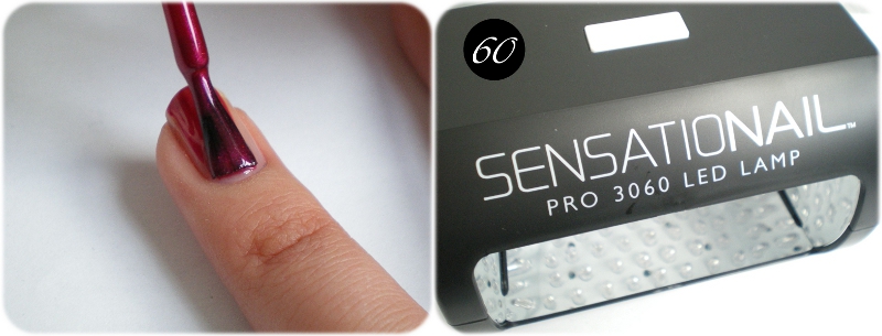 4) Farbe: Eine dünne Schicht Farblack auftragen und die Nägel 60 Sekunden unter die LED-Lampe halten. Das ganze so oft wiederholen, bis die gewünschte Deckkraft erreicht ist. In meinem Fall waren es drei Schichten.
