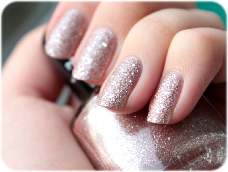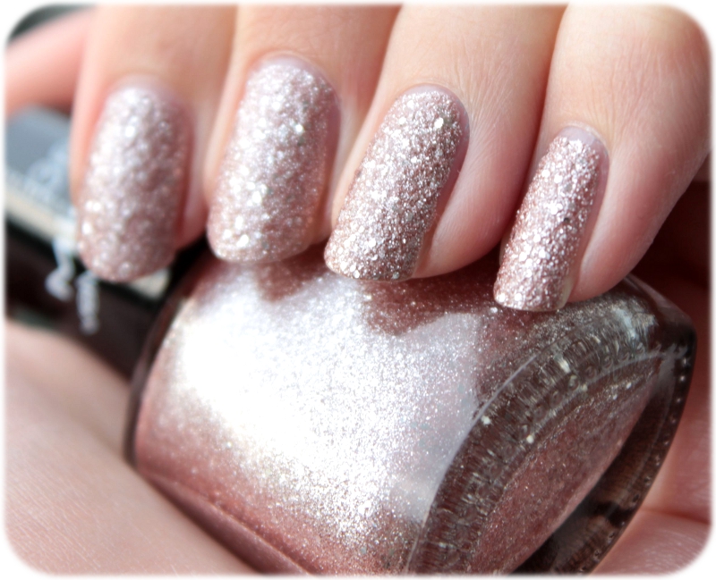 Den Grundton kann man wohl am besten als ein rosiges Champagner bezeichnen, das jenach Lichteinfall mal mehr so oder mehr so wirkt. Daneben besitzt dieser Schatz einige gröbere Glimmerpartikel, die ihm etwas besonderes verleihen. Das schöne ist hier, dass man das grobe Finish zwar durchaus merkt, aber keinesfalls so sehr, dass es stören würde. Man bleibt also nirgends hängen und gewöhnt sich schnell daran.
