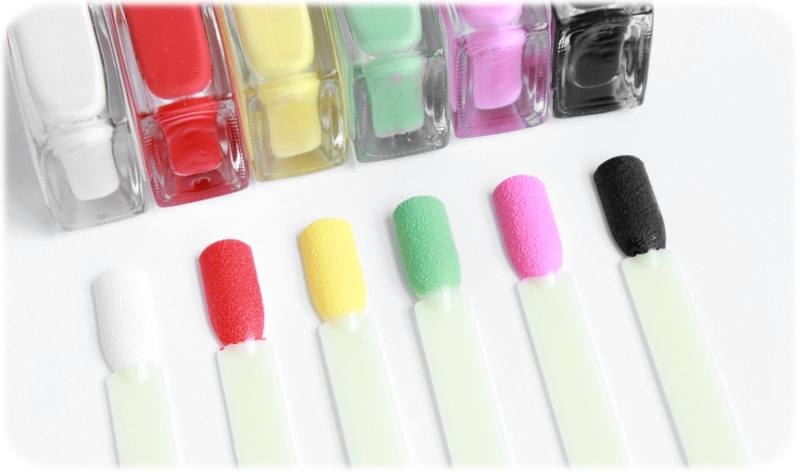 Anders als ein Großteil der Sandlacke besitzen die Sugar Coats jedoch keine Glitzerpartikel und haben somit ein noch matteres und vor allem körnigeres Aussehen. Tatsächlich erinnert es nach dem Trocknen ein wenig an bunte, matte Zuckerkörner.