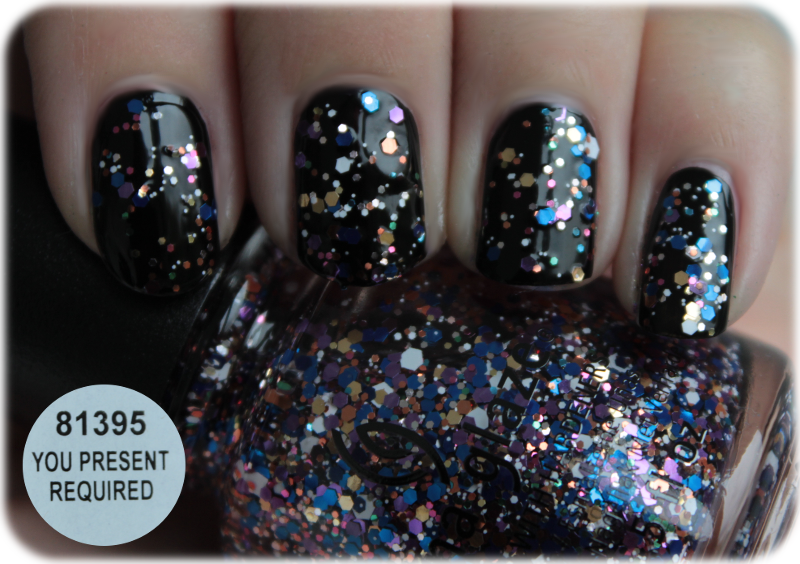 You Present Required: Kommen wir zu dem ersten ganz klaren Glitzertopper, bei dem das Licht grad nicht so prima war (Hier über Liquid Leather). You Present Required besteht aus verschieden großen Pailetten in Gold, Violett, Blau, Weiß und einigen anderen, nebenrangigen Farben wie Grün oder Pink.