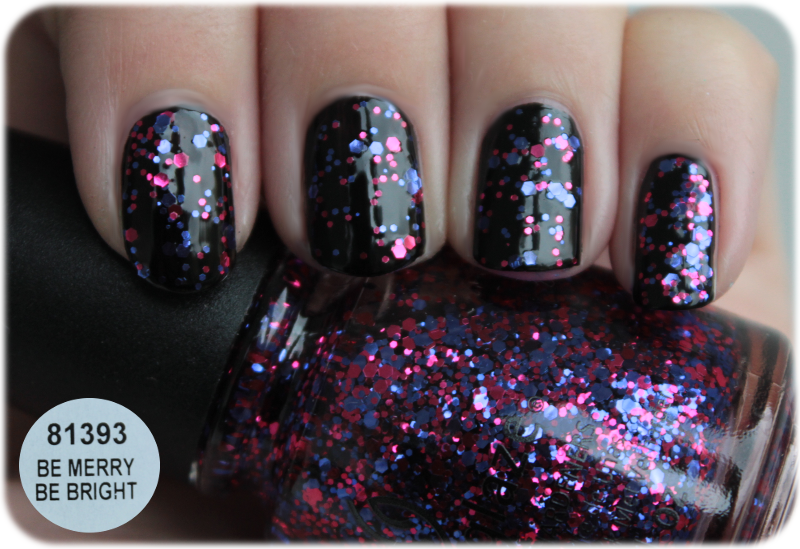 Be Merry Be Bright: Der nächste Glitzertopper besteht ganz klar aus zwei Farben: Violett-Blau und Pink. Auch hier sind wieder verschiedene Glitzerpartikel enthalten, die mittelmäßig konzentriert sind. Auf dem rechten Finger seht ihr zwei Schichten.