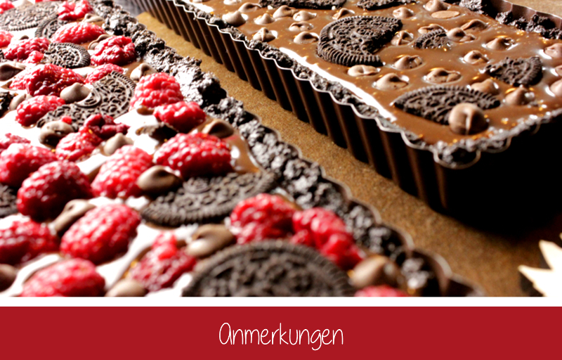Ganz ehrlich: Meiner Meinung nach braucht diese Tarte Obst! Zum Einen sieht es viel hübscher aus, wenn ihr einen Farbklecks habt und zum Anderen ist es sonst eine so schokoladige Sünde, dass es vielen zu süß sein wird (O-Ton auf dem Geburtstag: “Gott, ist das geil, aber ich kriege jetzt bestimmt Diabetes”). Solltet ihr gar kein Obst mögen, geht es natürlich auch ohne – dann würde ich aber zumindest bei der Kuvertüre Zartbitter und nicht Vollmilch nehmen. Ich glaube, mehr bleibt mir jetzt auch gar nicht mehr zu sagen. Außer: Das Rezept ist so kinderleicht, dass ich es jedem von euch empfehlen kann. Und als letzter Ratschlag: Das Ganze lässt sich super simpel verdoppeln, um zwei Tartes gleichzeitig zu machen.